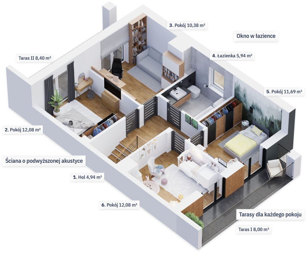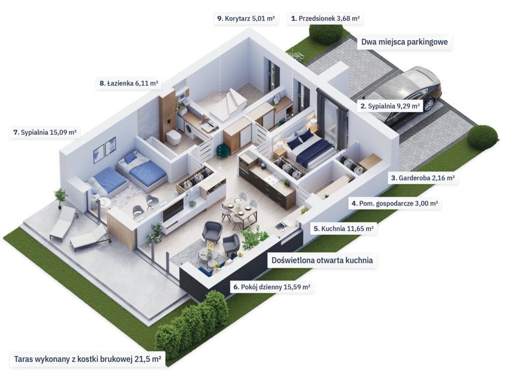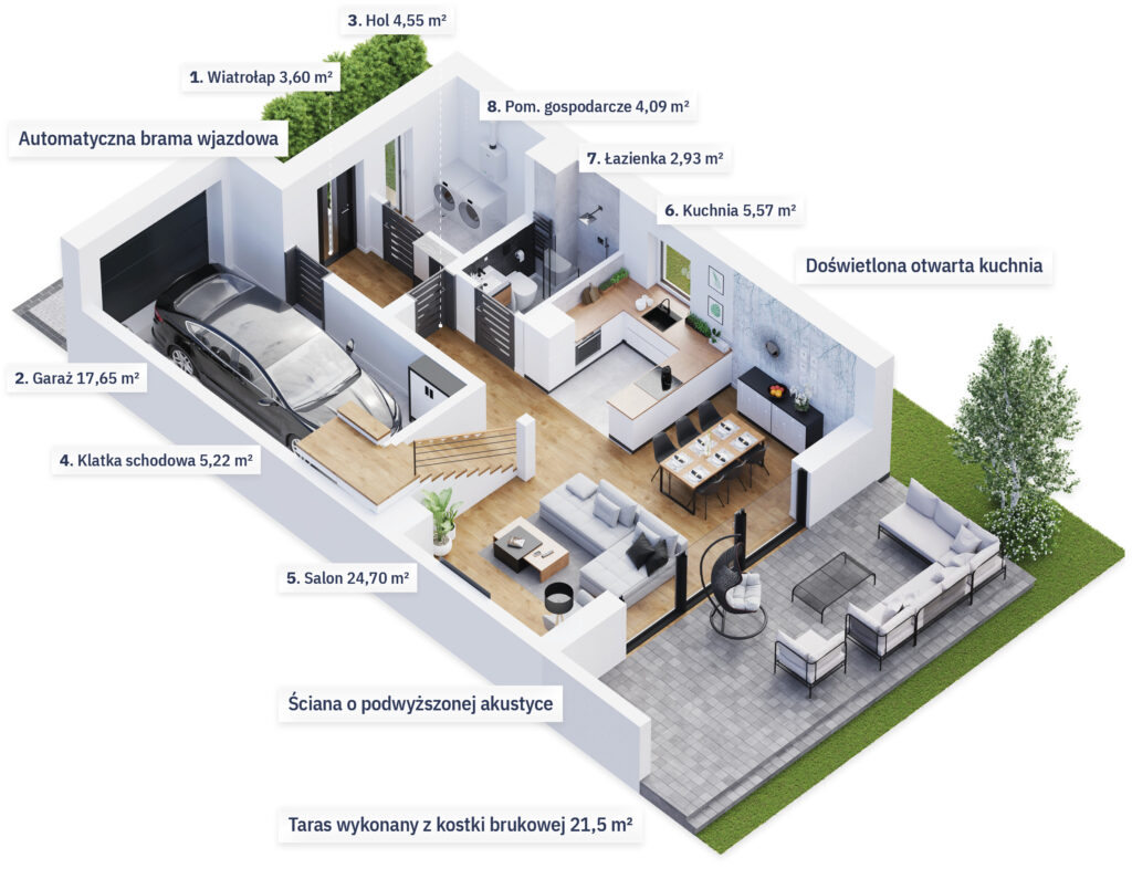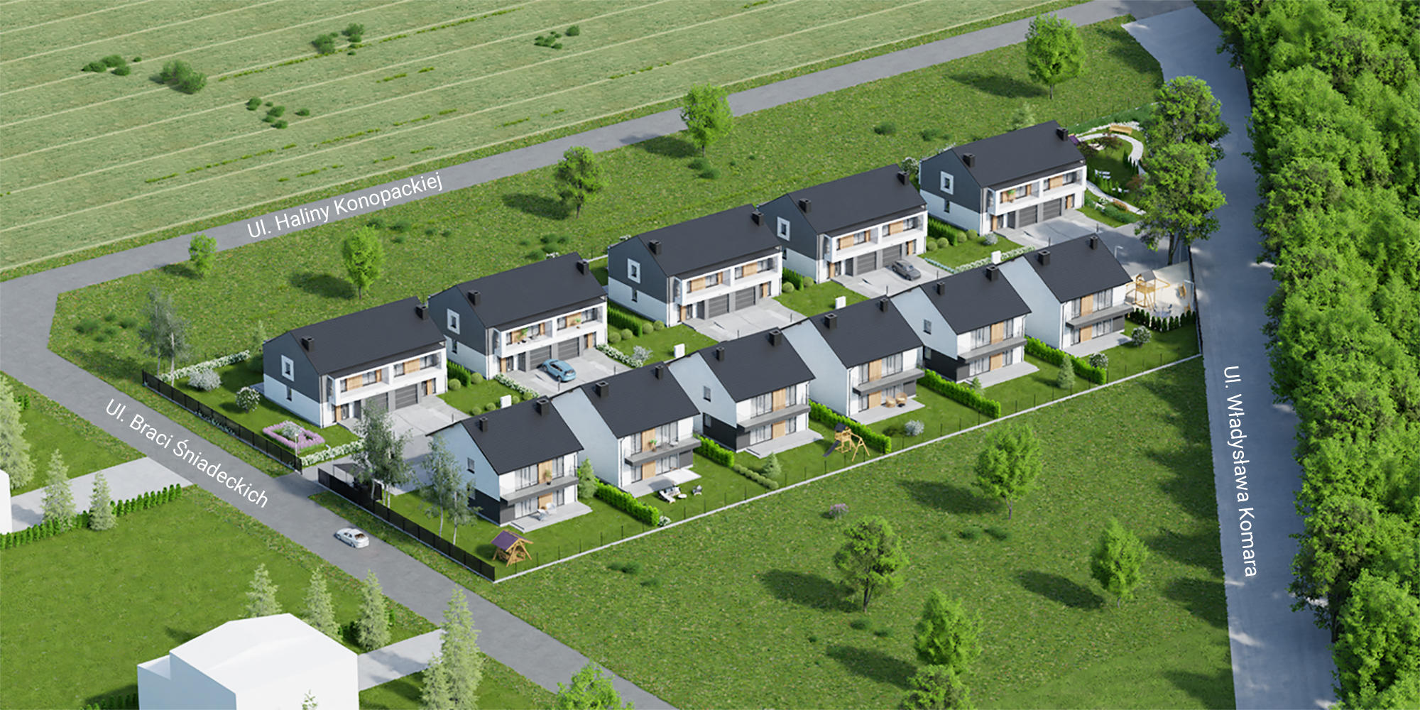 Polana Śniadeckich to kameralna inwestycja, obejmująca 5 domów bliźniaczych oraz 6 domów dwulokalowych, łącznie 22 apartamenty. Lokale w bliźniakach o powierzchni 125 m² mają trzy tarasy – jeden na parterze i dwa na piętrze z widokiem na prywatny ogródek i osiedle. W cenie znajduje się także garaż, dodatkowa przestrzeń na strychu do dowolnej aranżacji oraz miejsce postojowe przed budynkiem.