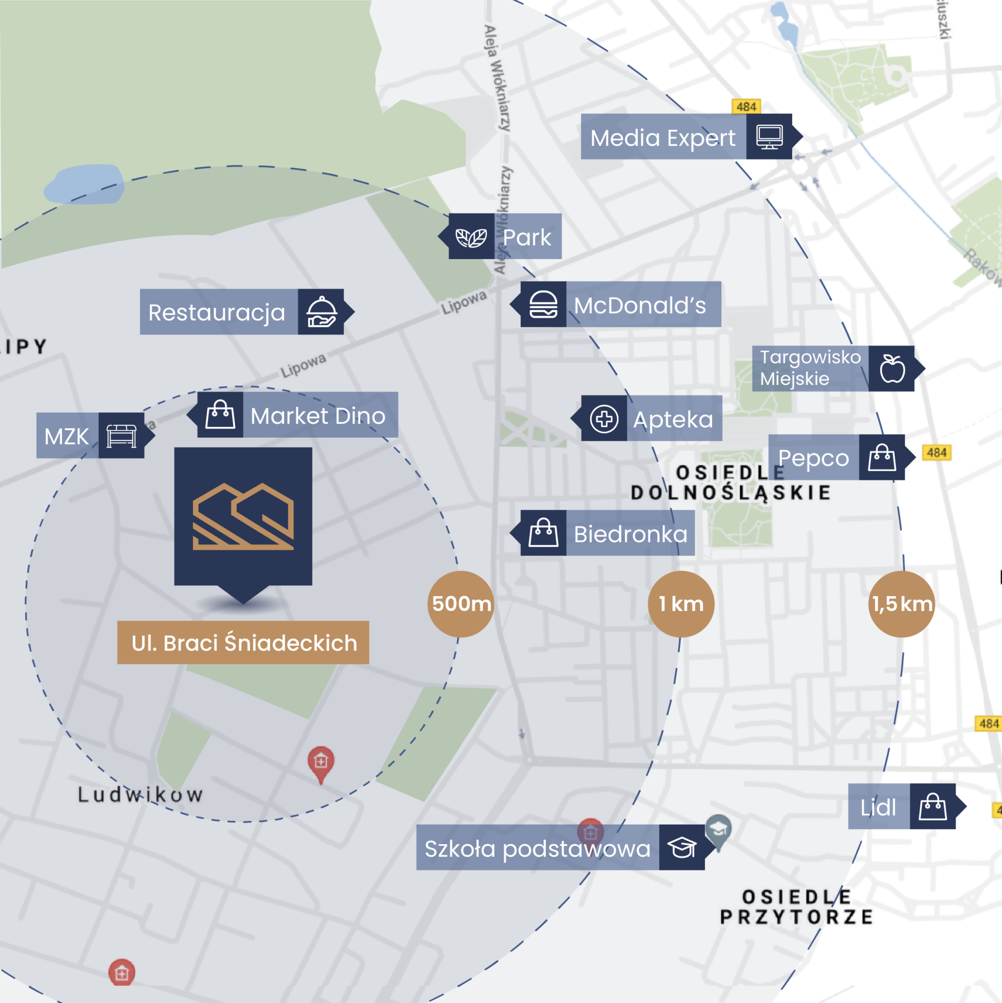 Inwestycja sąsiaduje z niewielkim, ale bardzo urokliwym Laskiem Ludwikowskim. W bezpośredniej okolicy nie brakuje również licznych ścieżek i terenów idealnych do biegania, jazdy na rowerze lub długich spacerów.